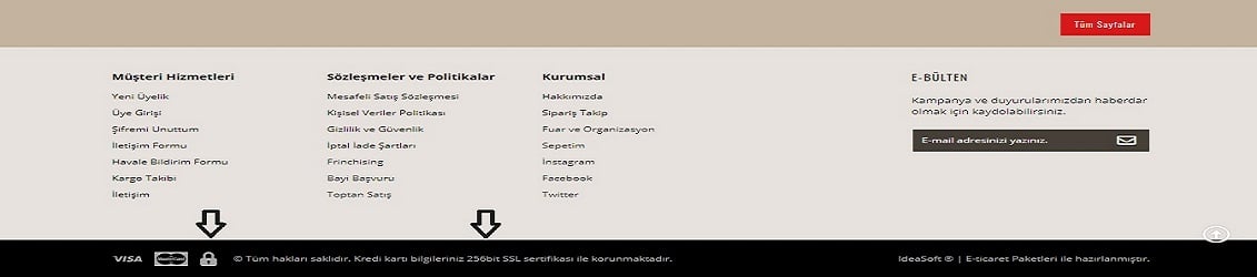 İkincisi ise yine sayfanın en alt satırında bulunan ve banka ile yapılmış olunan protokol sertifikasının ibaresidir. Bu güvenli bir internet sayfasında olduğunuzu gösterir ve her türlü bilgileriniz şifrelenerek korunur. Bu bilgiler, ancak satış işlemleri sürecine bağlı olarak ve verdiğiniz talimat istikametinde kullanılır. Alışveriş sırasında kullanılan kredi kartı ile ilgili bilgiler alışveriş sitelerimizden bağımsız olarak 256 bit SSL (Secure Sockets Layer) protokolü ile şifrelenip sorgulanmak üzere ilgili bankaya ulaştırılır. Kartın kullanılabilirliği onaylandığı takdirde alışverişe devam edilir. Kartla ilgili hiçbir bilgi tarafımızdan görüntülenemediğinden ve kaydedilmediğinden, üçüncü şahısların herhangi bir koşulda bu bilgileri ele geçirmesi engellenmiş olur.